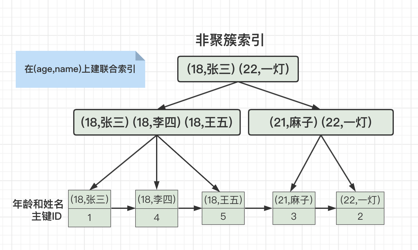 图中就是在(age,name)两个字段上建立的联合索引,在B+树中的存储结构。